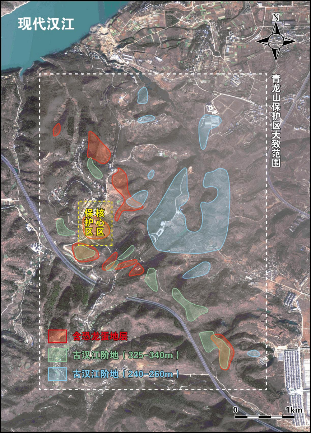 青龙山恐龙蛋化石群保护区古汉江遗迹分布范围示意图。(青龙山保护区地质遗迹调查团队供图)