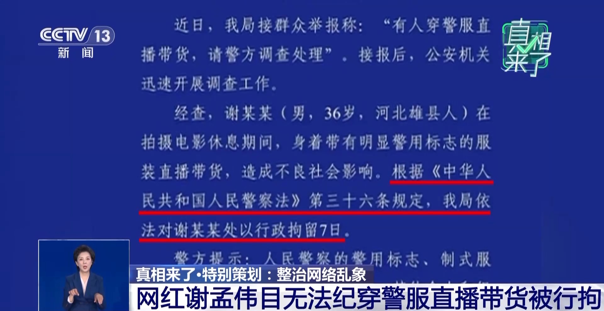 在被群众举报后,云南耿马傣族佤族自治县公安局发布警情通报称:谢孟伟在拍摄电影休息期间,身着带有明显警用标志的服装直播带货,造成不良社会影响。依据《中华人民共和国人民警察法》第三十六条规定,依法对其处以行政拘留7日。